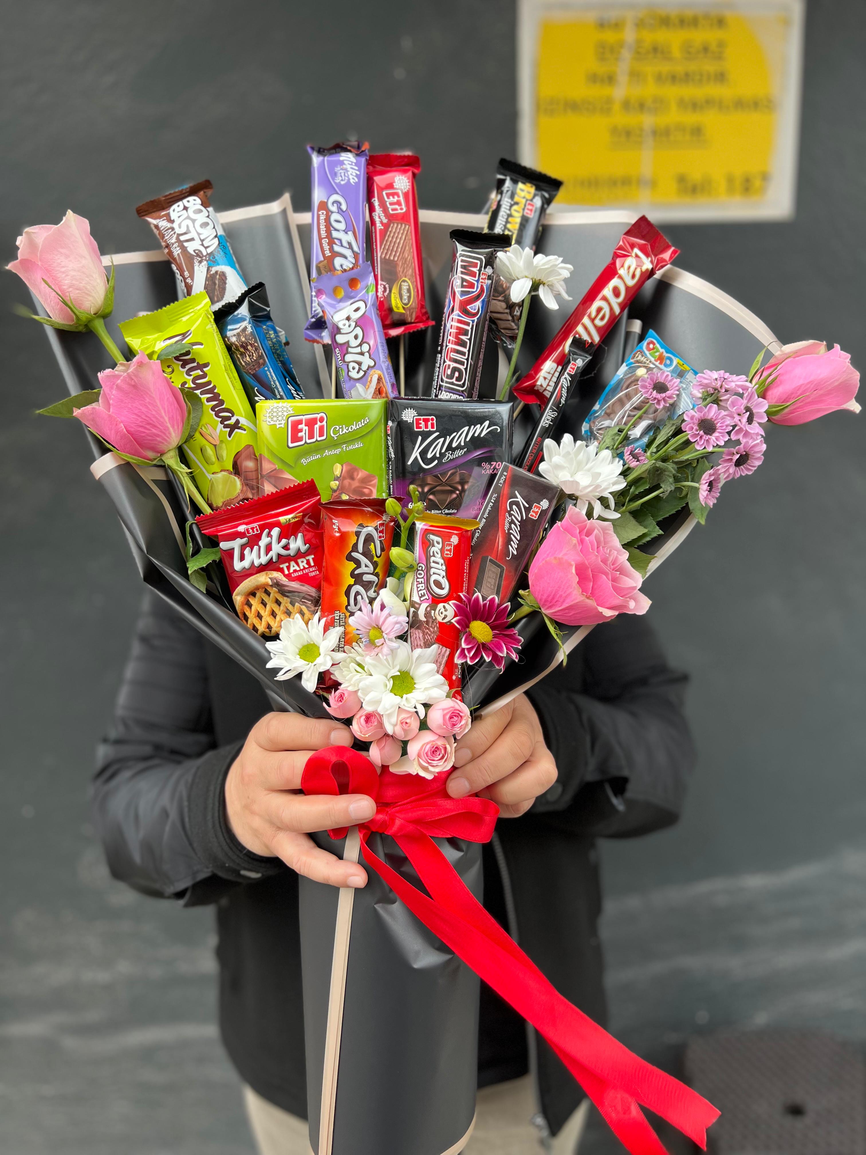 çikolata ve canlı çiçeklerden oluşan bir buket